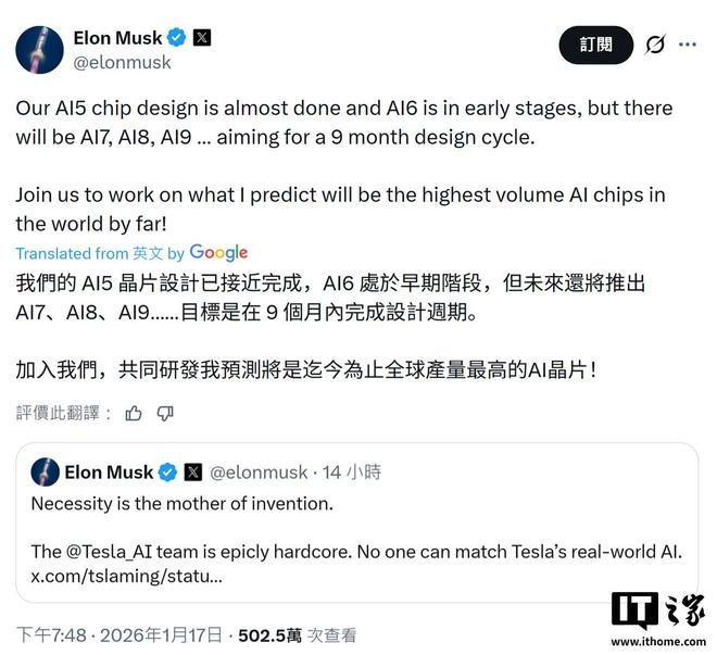 IT之家 1 月 18 日消息,埃隆 · 马斯克昨天在 X 平台表示,特斯拉 AI5 芯片已接近设计完成,而 AI6 芯片目前处于早期阶段,后续还将推出 AI7、AI8、AI9,目标是在 9 个月内完成设计周期。