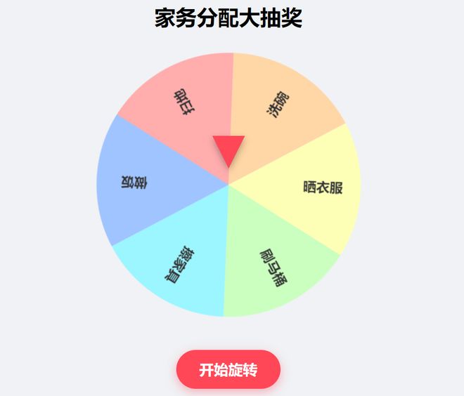 比如说,我们现在用TRAE做了一款家务分配幸运转盘,它生成的初版作品,转盘是倾斜的3D样式,部分字被遮挡了,不太方便看。