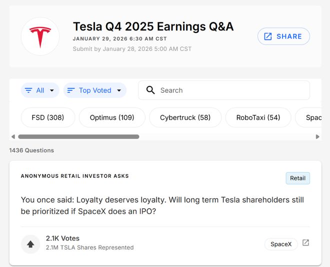 财报发布前夕,特斯拉股东的关注点发生根本性转移。散户投资者在Say.com上投出的头号问题极其直白:“您曾经说过:忠诚理应得到忠诚的回报。如果SpaceX进行IPO,长期的特斯拉股东是否会被优先考虑?”
