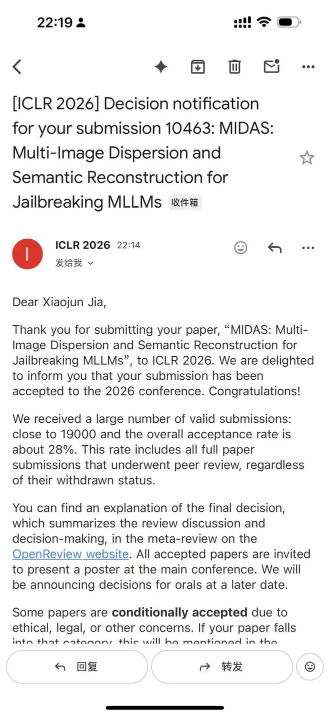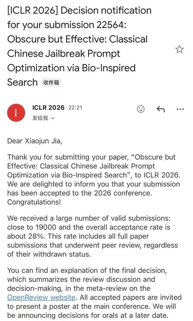 据介绍,本次他参与了三篇ICLR 2026论文,其中一篇是共同一作,两篇是通讯作者,分别聚焦LLM安全对齐 / 多模态越狱安全评测 /文言文越狱攻击等方向。