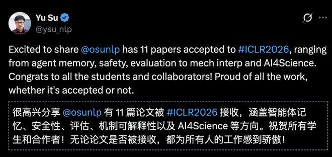 被誉为诺奖风向标之一的斯隆研究奖得主、OSU教授Yu Su实验室中了11篇,激动发帖:「OSU NLP Group中了11篇,涉及智能体记忆、安全、评估、机制解释性以及面向科学的AI等话题。」