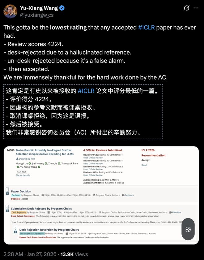 因误报虚构参考文献,被ICLR 2026桌面拒稿,最后柳暗花明,Yu-Xiang Wang分享了「有史以来ICLR中稿论文」最低的一篇的故事。