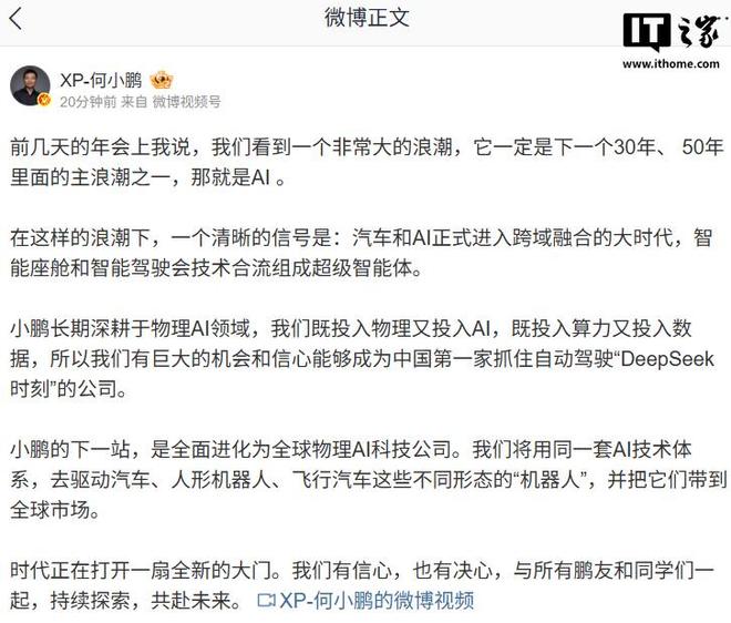 IT之家 2 月 1 日消息,小鹏汽车董事长何小鹏今日发文回顾公司年会,他认为 AI 一定是下一个 30 年、 50 年里面的主浪潮之一。
