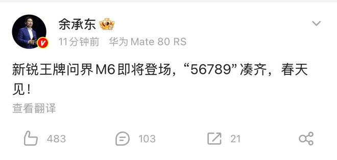 2月2日,华为常务董事、产品投资评审委员会主任、终端BG董事长余承东在微博发帖称,新锐王牌问界M6即将登场,“56789”凑齐,春天见!