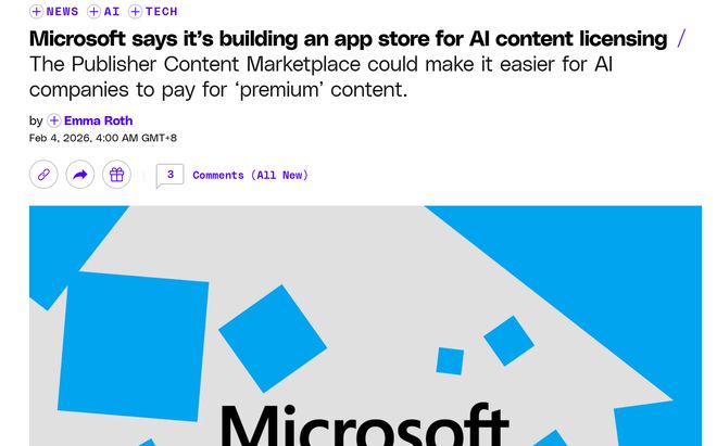 【环球网科技综合报道】2月5日消息,据The Verge报道,微软近日正式启动“出版商内容市场”(PCM)计划,打造AI时代的内容授权集中平台,为AI模型训练提供合规内容支撑,雅虎作为首批合作伙伴已接入测试。