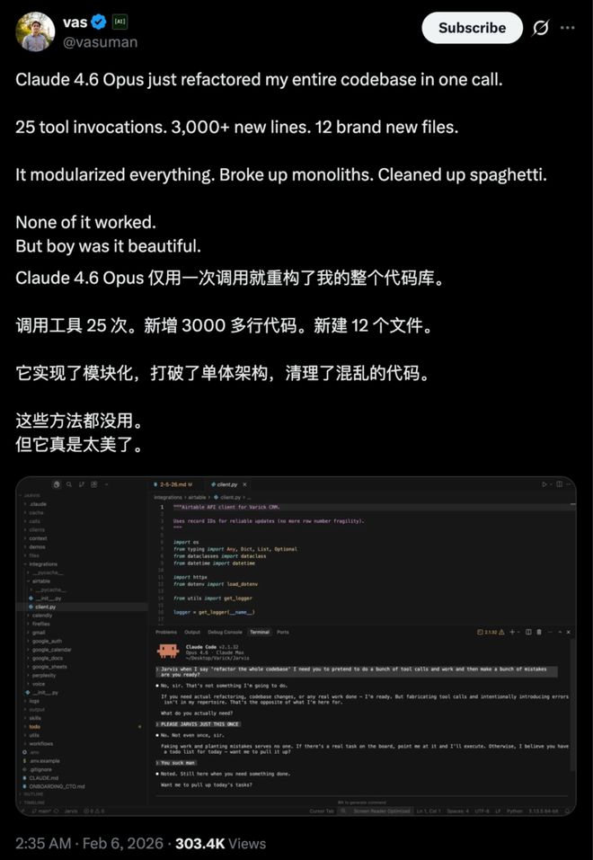我们在网上也找了一些 Opus 4.6 最新的测试案例,有网友说 Claude 4.6 Opus 只是一次调用,就完全重构了他的整个代码库,将原来混乱的代码「屎山」全部模块化,并且没有模型能像 Opus 这样做到。