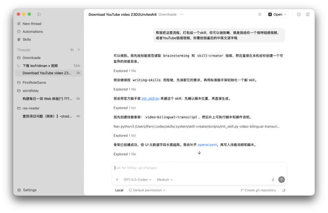 ▲ 在 Codex App 内可以直接选择 GPT-5.3-Codex 模型,也能选择深度思考的强度和之前介绍 Cowork 的能力一样,我们也丢了一些类似的任务让 Codex 来完成,像是直接处理本地文件、各种格式转换、调用不同的 Skills 组合能力、做 Word/PPT/Excel、下载视频、开发 App……