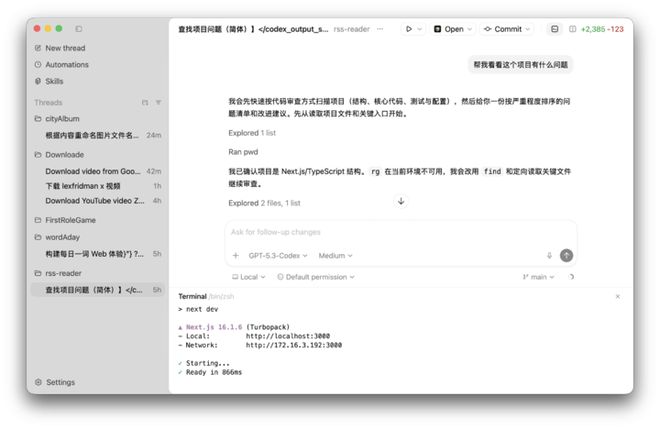 如果我们有现成的代码项目,也可以选择该项目文件夹,在 Codex 中打开,GPT-5.3-Codex 会分析项目存在的 Bug,并且修复它。