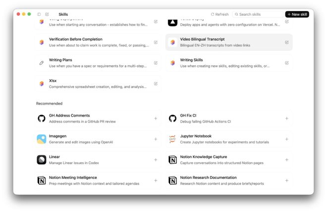 和 Claude Skills 一样,Codex 也能安装 Skills 市场上丰富的技能,并且在应用内,就已经提供了包括 pptx、xls、word、canvas、notion 在内的多款技能。