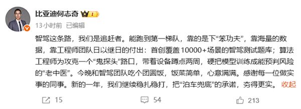 他还进一步做出了解释:首创覆盖10000+场景的智驾测试题库;算法工程师为攻克一个"鬼探头"路口,带着设备蹲点两周,硬把模型训练成能预判风险的"老中医"。