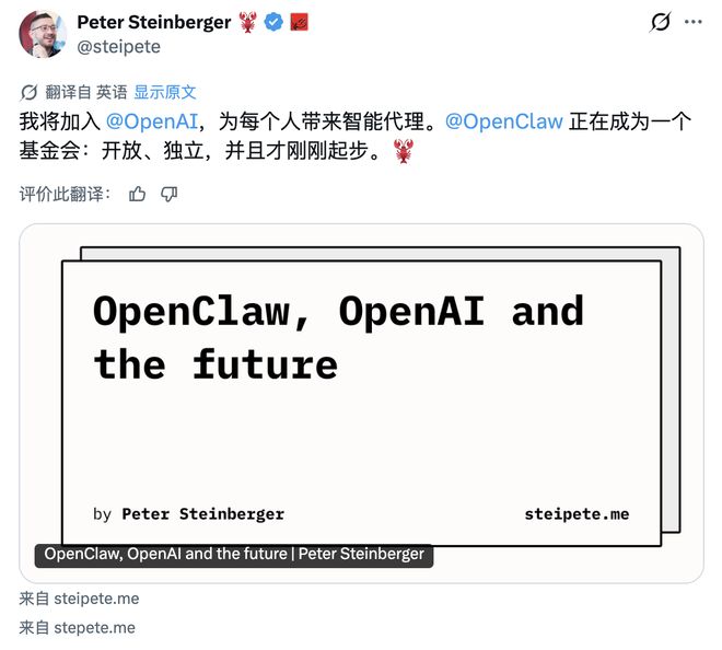 相关阅读:OpenClaw之父宣布加入OpenAI,小扎抢人失败