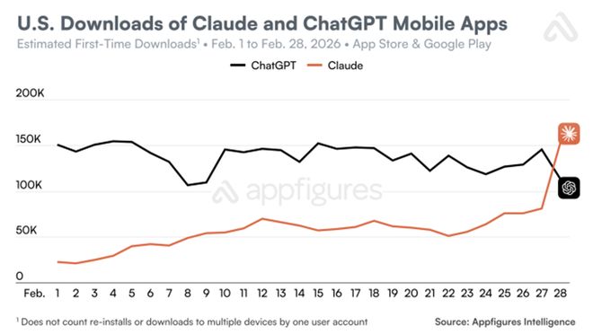 在Anthropic公开宣布拒绝与美国国防部合作后,2月27日Claude在美国的下载量环比增长37%,2月28日增长51%。