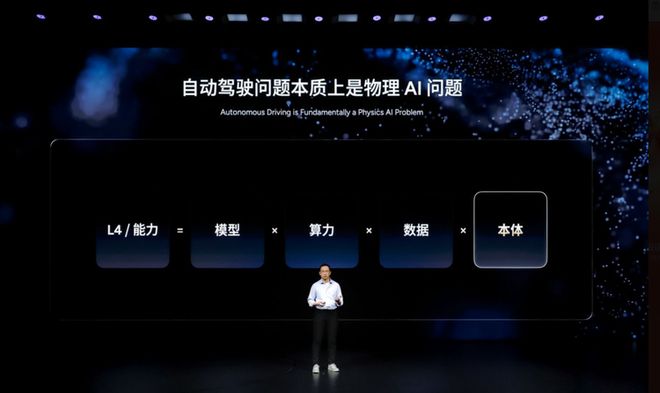 这次刘先明也说,自动驾驶的本质是物理 AI 问题,它无非是模型、算力、数据、本体的集合。