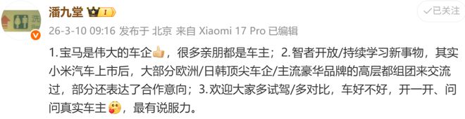 小米高管小米产业投资部合伙人潘九堂针对此事也做了个被认为是高情商的回应,潘九堂首先认可了宝马是伟大的车企,并表示很多亲朋都是宝马车主。其次,他表达了很多欧日韩车企与小米表交流过,部分还有合作意向;最后,他表示,车好不好,开了才知道,并欢迎大家试驾。