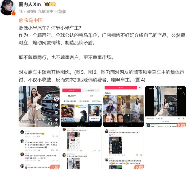 电动知家消息,近日,一位宝马门店销售在门店直播中,公开发表大量针对小米汽车及车主的极端贬低、侮辱性言论。说什么“杂粮品牌”、“180天造的车不敢开”,甚至言语侮辱小米车主,引发舆论哗然后。