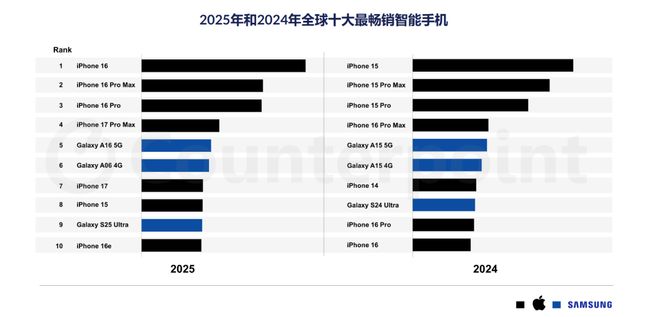 Omdia 说苹果全年出货量干到了 2.406 亿部,同比增长 7%;Counterpoint 更直接,说苹果市场份额干到了 20% ,iPhone 16 更是直接登顶全球最畅销机型,前十榜单里光是苹果就占了 7 个席位。