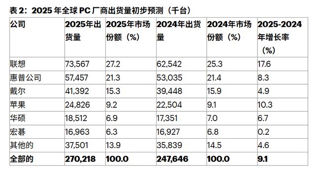 根据 Gartner 的预测数据,2025 年全球 PC 出货量增长了 9.1% ,突破了 2.7 亿台。这增长主要靠两件事:一是 Windows 11 的升级潮,逼着企业换机器;二是大家都怕 2026 年存储涨价,很多企业都在提前囤货。