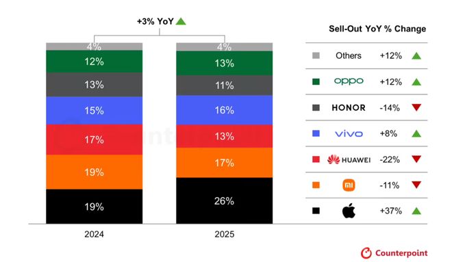 2025 年 “ 双 11 ” 期间,iPhone 销量同比涨 37% ,而小米降了 11%、华为降了 22%,原因主要还是因为小米 17 系列发布提前,销售高峰前移;华为 Mate 80 系列赶不上大促,错过了这波流量红利。