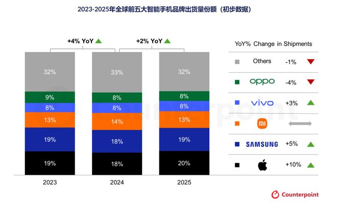 不过这里有个细节 —— 从 2026 年 1 月起,realme 正式并入 OPPO 体系了,这意味着明年再算账的时候,OPPO 加上 realme 的销量,全球排名恐怕要往上窜一窜。