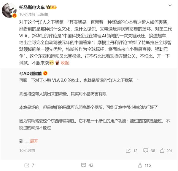 对此,小鹏汽车副总裁于涛(@ 托马斯电火车)表示,对于这个"洋人之下我第一"其实我是一直带着一种戏谑的心态看这帮人如何表演,能看到的是那种没什么文化,没什么见识,又精通玩弄民粹恶臭的蔫坏。