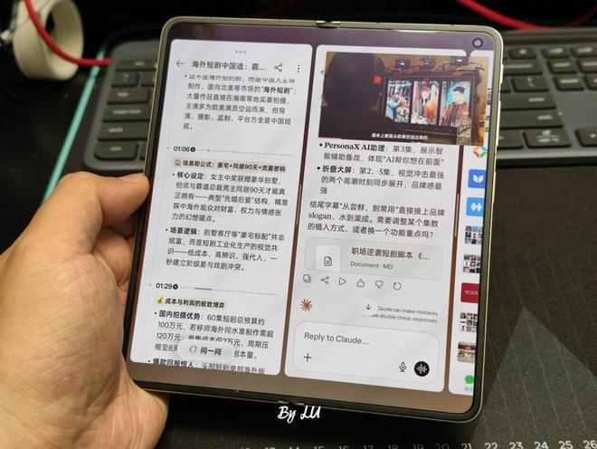 更直接的体现在Find N6展开状态下:8.12英寸内屏提供充足的显示空间,全景自由窗支持最多同时开启四个应用窗口。你可以一边在左侧窗口继续手头的工作,右侧窗口打开小布进行记忆问答:“帮我找一下上周闪记的那篇行业报告里,具体是哪个数字来着?”