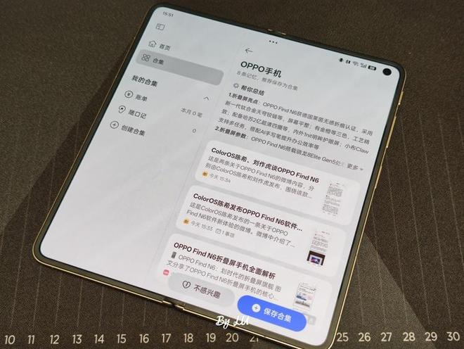 「一键闪记」是入口。Find N6 机身上有一枚专属实体闪记键,无论你在什么 APP 里,看到任何值得留存的内容,按下去,AI 自动提取关键信息、生成摘要,归入你的个人知识库。这个键的位置经过设计,单手握持时拇指自然落点,不需要解锁、不需要切换应用——你正在看什么,它就记什么。