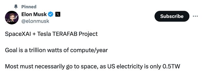 根据马斯克的描述,Terafab的长期目标极具野心:年算力产能为1太瓦(TW),相当于当前全球AI芯片年总算力的约50倍;马斯克同时指出,美国全年发电量约为0.5太瓦,凸显地面算力扩张的能源约束,因此计划将80%产能投向太空轨道AI基础设施,仅20%用于地面应用。