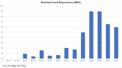 伯克希尔股票在一季度上涨近11%后,二季度又上涨了8.5%,上半年累计上涨23.7%,同期标普500指数涨幅为18.1%。而在2019年和2020年,伯克希尔的股票表现均落后于大盘。
