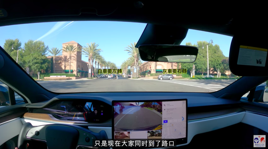视频中,走纯视觉路线的特斯拉,能够从傍晚开到晚上,路上碰到施工可以准确绕行,能识别出自行车和行人,还能处理非常复杂的路况。在一个十字路口时,它面对对面的白车要左转,灰车要右转,同时还有一对行人牵着狗在过红绿灯,特斯拉不仅准确应付了复杂路况,也读懂了信号灯,知道自己什么时候该走。