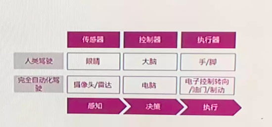 从下图中能看出,人类驾驶基本可分为三个步骤:眼睛来感知,大脑做决策,手、脚去执行。无人驾驶类比了这个过程,感知部分用的是摄像头、雷达,决策是电脑,执行则是油门、制动等。