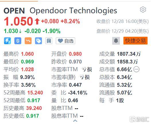 格隆汇12月29日丨Opendoor Technologies(OPEN.US)盘前跌1.9%,报1.03美元。据美国SEC 12月23日披露的文件,Opendoor Technologies首席投资官Morillo Daniel于12月20日、21日以每股平均价1.26美元售出13.27万股股份,价值约为16.72万美元。