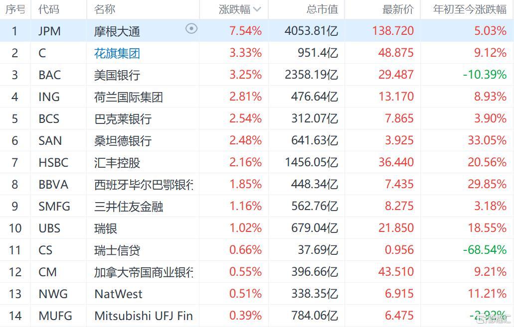 格隆汇4月14日丨摩根大通涨7%,花旗、美国银行涨3%,巴克莱银行、汇丰银行、桑坦德银行涨2%。摩根大通等多个银行股发布业绩超预期。