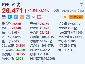 格隆汇5月1日|辉瑞(PFE.US)涨3.3%,报26.47美元。辉瑞第一季度营收149亿美元,市场预估139.1亿美元;调整后每股收益为0.82美元,市场预期为0.51美元。期内非新冠类药物的销售额超出市场预期。辉瑞上调盈利指引,预计2024年调整后每股收益为2.15至2.35美元,高于之前的2.05至2.25美元,分析师预期为2.21美元。