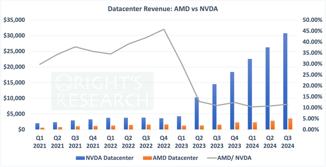 从英伟达与 AMD 在 AI 数据中心领域的角度来看,我们可以重现过去几年的收入情况,正如您所见,AMD 的收入增长并不像英伟达那么明显。另一方面,我们看到在 2023 年第二季度左右 AMD 宣布推出 MI300A 和 MI300X 时收入趋于稳定。