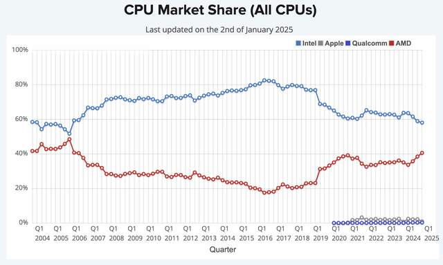 虽然 AMD 也非常重视 AI GPU 业务,但市场尚未考虑到 CPU 方面的积极发展,AMD继续从英特尔手中夺取市场份额。根据 CPU Benchmarks 的最新实时数据,AMD 在所有 CPU 中的市场份额为 40.5%,为 20 年来的最高水平。在某些领域,例如台式机市场份额,AMD 已经以 53.6% 的市场份额超越英特尔。