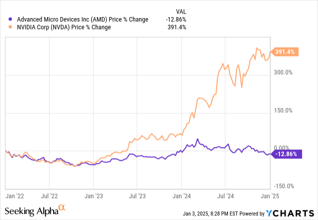 AMD ( NASDAQ: AMD ) 是 CPU 和 GPU 市场领先的半导体公司之一,近年来发展不顺。与其最接近的竞争对手之一英伟达相比,该公司股价在过去 3 年中下跌了 12.86%,而英伟达则上涨了 391.4%。