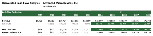 到 2028 年,其总收入将达到 767.4 亿美元。在下面的折现现金流分析中对这些估计进行了建模,以确定内在价值。随着高利润率 AI 数据中心收入部门的扩大,我们还模拟了自由现金流利润率扩大到 35%,但这与英伟达在 TTM 基础上的 49.9% 的自由现金流利润率仍相去甚远。