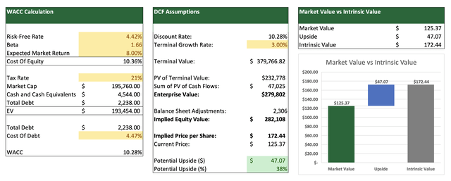 下面,你还可以看到我们用来贴现 AMD 自由现金流的假设。对于股权成本,我们使用基于 5 年期国债收益率的 4.42% 无风险利率、基于过去 60 个月的 1.66 贝塔系数和 8% 的预期市场回报率。对于债务成本,我们将 TTM 利息成本除以总债务,得出 4.47% 的利率。这使我们的加权平均资本成本为 10.28%。然后,我们使用合理但仍然乐观的 3% 终增长率来获得我们的终值 3797.7 亿美元,折现为 2327.8 亿美元。通过加上该期间 470 亿美元的折现现金流总额,我们得出 2798 亿美元的企业价值。