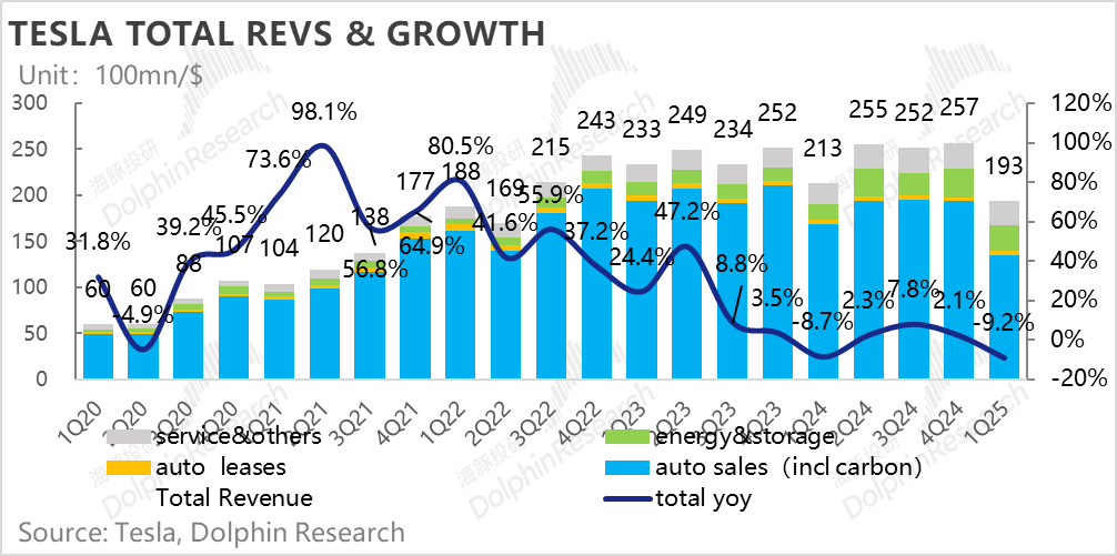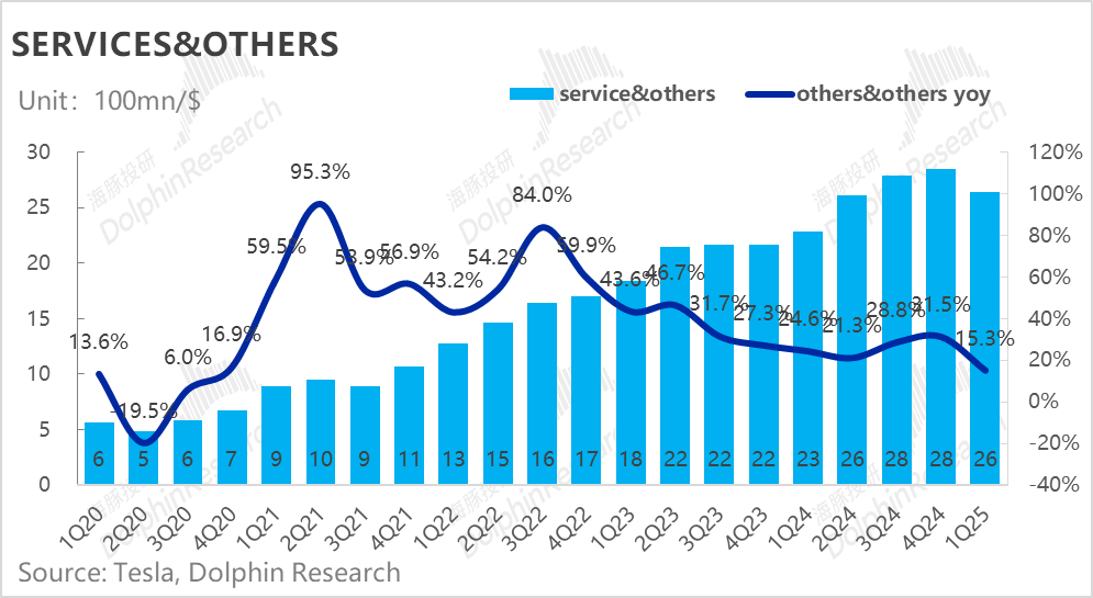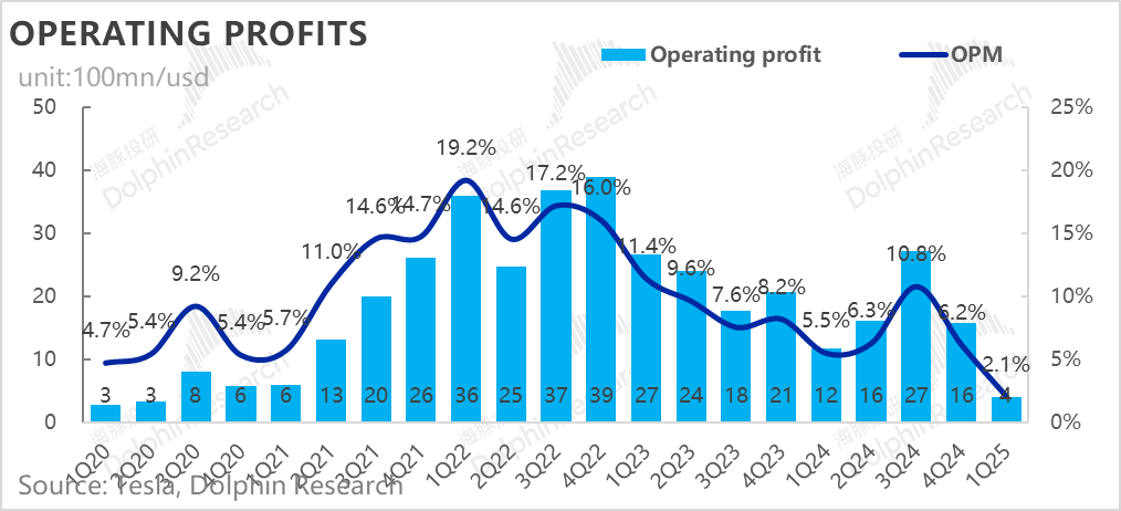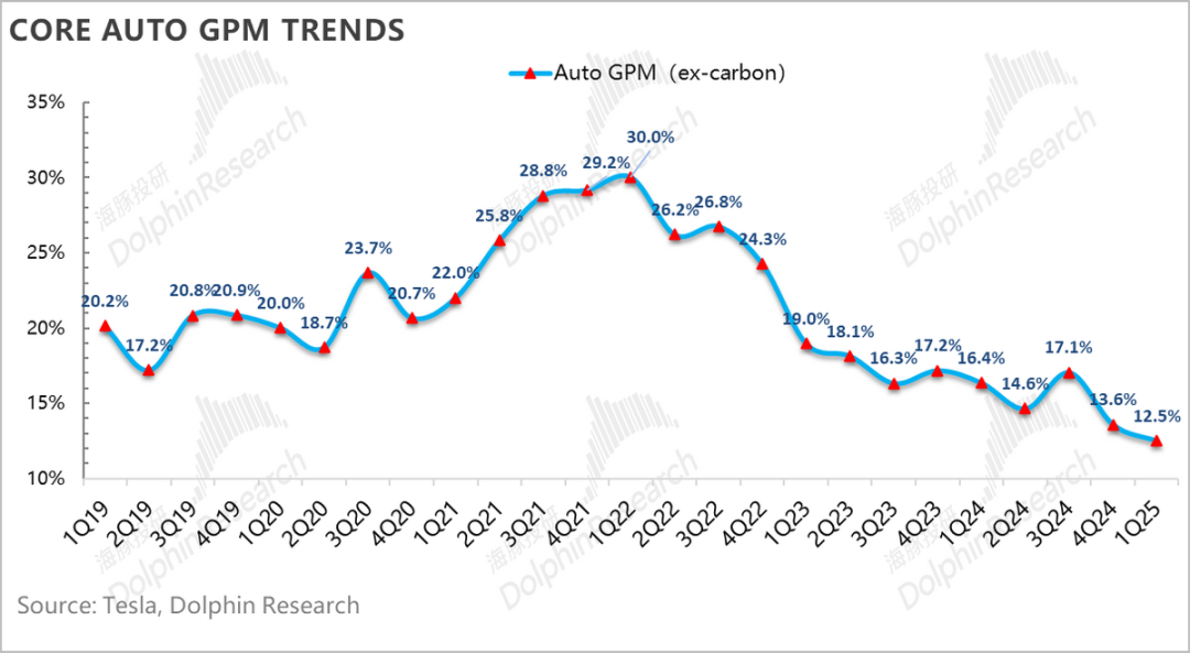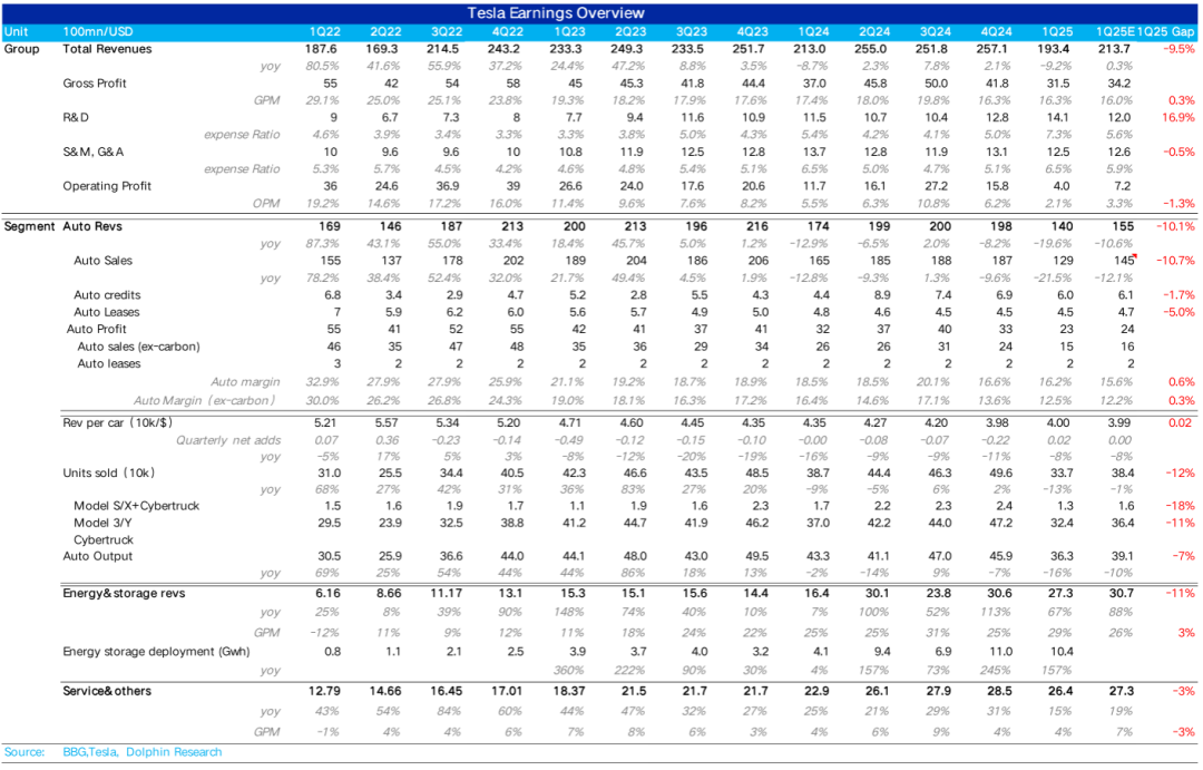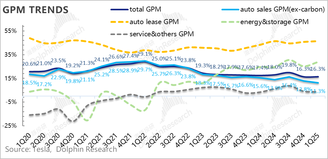 一季度汽车销售毛利率(剔碳积分和租赁)12.5%,虽然还在继续环比下滑(环比下滑了约1.1个百分点),但由于一季度的销量低点,叠加由于Model Y Juniper发布的投产影响,市场对于下滑的卖车毛利率早有预期,市场对于本季度纯卖车毛利率的一致预期在12.2%,而海豚君看到的部分大行更为悲观,预期已经降低到11%-12%左右,所以在纯卖车毛利率上,特斯拉本季度表现是要超出市场预期的。