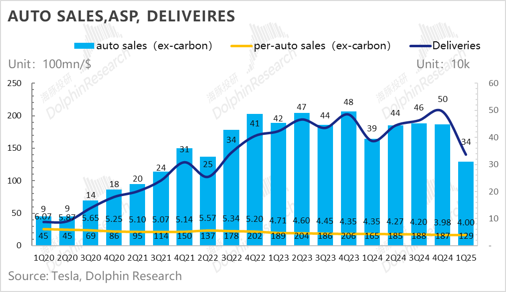 从卖车的单价端来看,一季度,特斯拉每卖一辆车的收入(不含碳积分与汽车租赁销售)是4万美元,相比上季度还要3.98万美元还要环比提升200美元,卖车单价在一季度低谷期基本稳住,所以卖车单价表现海豚君认为还可以。