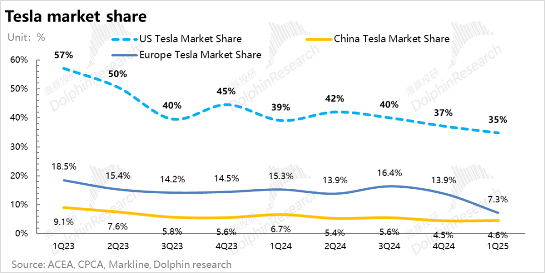 2. 而分地区来看:特斯拉在欧洲区实际表现最差,销量环比下滑43%,在欧洲新能源车中市占率也从上季度13.9%环比下滑6.7个百分点至本季度7.3%,美国地区的特斯拉市占率也环比下滑了2个百分点,海豚君认为一方面是Model Y车型换代影响,但另一方面短期更重要的是欧洲和美国的市占率下行受到马斯克政治活动引发的品牌价值损伤,这对欧洲影响尤为显著,因为企业车队买家占欧洲销量的近 50%。