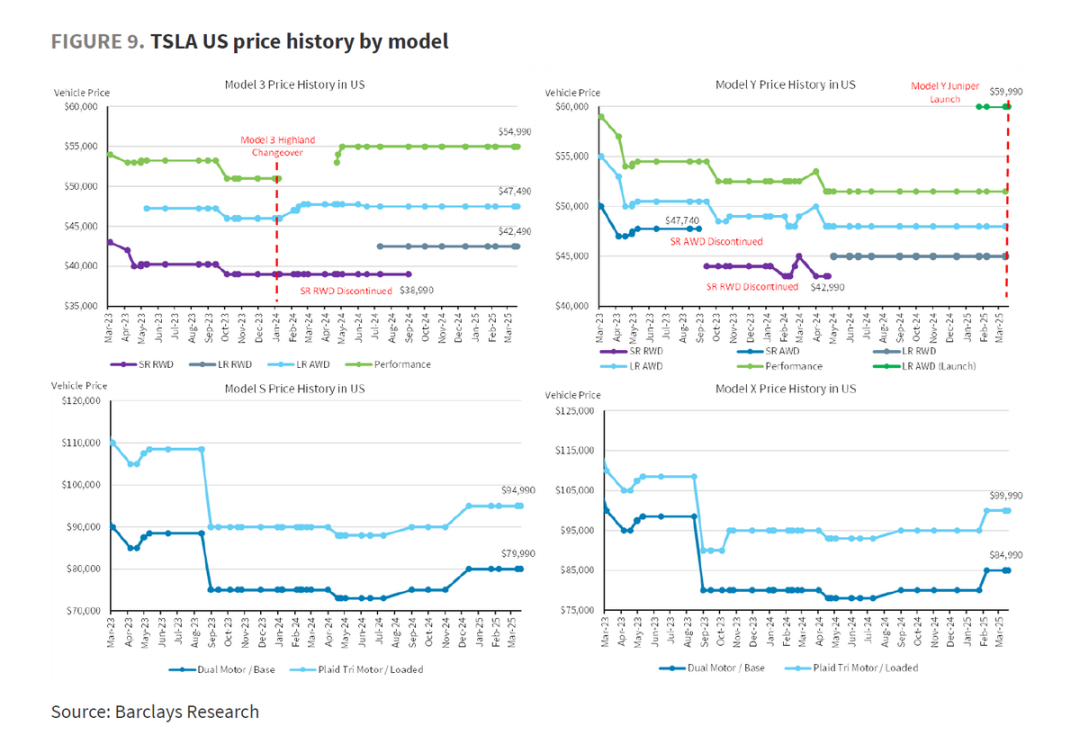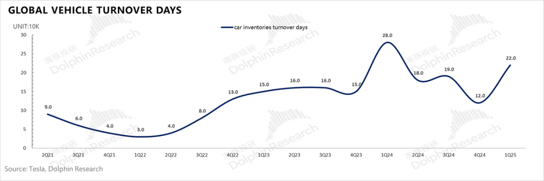 a. Model Y Juniper的换代的部分影响:在2025年2月,特斯拉在全球四大工厂(上海、柏林、弗里蒙特、奥斯汀)同步更新了 Model Y “Juniper” 车型的生产线。而在切换期间,库存中的旧款 Model Y 以折扣价出售,同时接受 Juniper 车型的预订单,可能会导致客户对新款 Model Y 的等待。而新款 Model Y 于 2 月 26 日在中国、3 月 7 日在欧洲、3 月 8 日在美国才开始陆续销售。