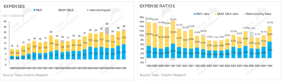特斯拉本季度研发开支和销售费用又在继续加大,研发费用14.1亿,高于市场预期12亿,预计由于AI智能化投入以及新车系研发投入加大,而销售与行政费用本季度12.5亿,基本和市场预期12.6亿持平。