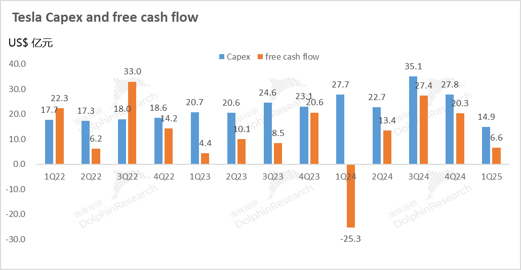 而由于特斯拉FSD算力端部署基本已经告一段落,本季度资本开支继上季度达到顶峰35亿后环比下滑至本季度27.8亿,最后自由现金流本季度20亿,环比下滑7亿。