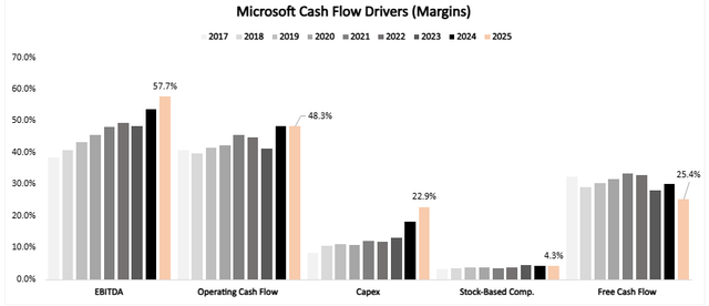 微软未来近中期 15% 以上的营收增速(每股收益增速将更高)已是板上钉钉。17% 的上涨空间是保守预期,而随着自由现金流改善(我预计很快就会到来),其估值倍数有望大幅提升。