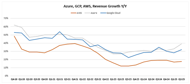 Azure 的增长率达 39%,远超谷歌云的 32% 和 AWS 的 17%。此外,Azure 环比增长 6 个百分点,而谷歌云环比增长 4 个百分点,AWS 则持平。Azure 已连续七个季度保持 30% 以上的增长率。