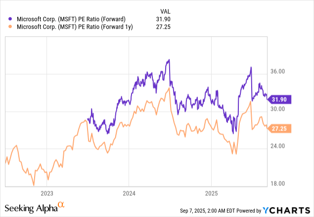 在近期下跌之后,微软的股价目前与历史水平持平或略低于历史水平。目前股价为每股495美元,市盈率为32倍,明年预期市盈率为27倍。
