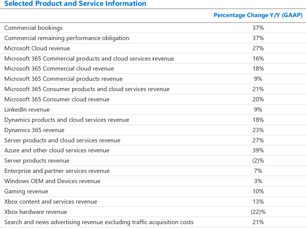 其他显著的增长项目包括预订量和 RPO 增长 37%、M365 增长 10%、Dynamics 增长 23% 以及搜索和新闻广告增长 21%。