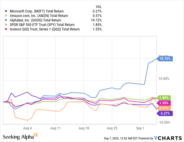 股价下跌的原因显而易见:一方面是 GPT-5 的发布略令人失望,另一方面是投资者担忧亚马逊(AMZN)和谷歌(GOOG)会在 AI 商业化和云业务增长上迎头赶上。
