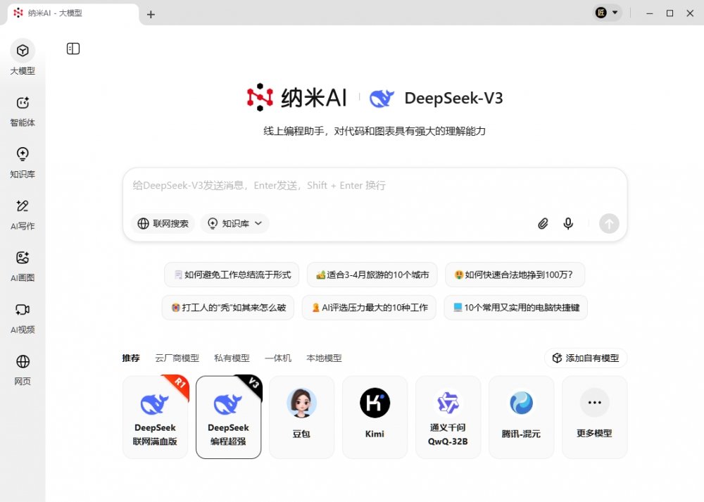 纳米AI在全面接入DeepSeek-V3-0324大模型的基础上,深度融合自研知识库系统,构建起“顶尖编程能力+企业级知识管理”的双引擎架构。通过知识库的动态学习和多模态解析能力,为开发者、企业、教育机构等群体带来从技术实现到知识沉淀的全链路赋能,也为个人用户带来全新的大模型使用体验。用户可以在纳米AI推荐的大模型库中,选择DeepSeek-V3-0324,即可享受到高速流畅、效果提升的全新一版大模型服务。